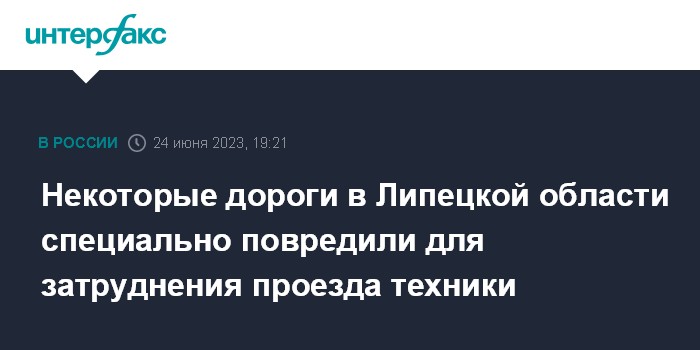 Москва. 24 июня. INTERFAX.RU - Власти Липецкой области сообщили, что некоторые дороги были специально повреждены для затруднения передвижения техники.