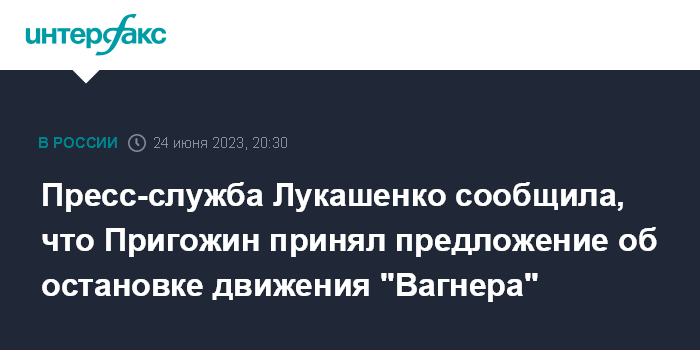 Москва. 24 июня. INTERFAX.RU - Президент Белоруссии Александр Лукашенко провел переговоры с руководителем группы "Вагнер" Евгением Пригожиным, в результате которых тот принял предложение об остановке движения бойцов группы по территории России, сообщила пресс-служба президента Белоруссии.