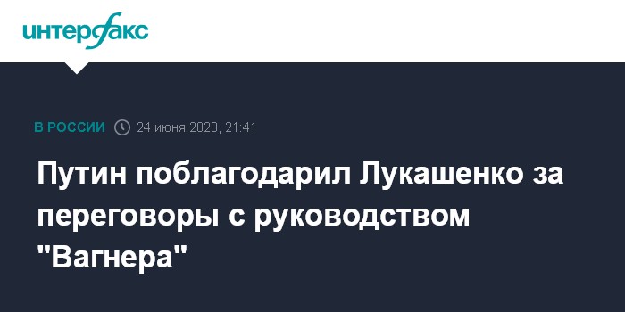 Ранее со ссылкой на пресс-службу президент Белоруссии сообщалось, что Лукашенко провел переговоры с руководителем группы "Вагнер" Евгением Пригожиным, в результате которых тот принял предложение об остановке движения бойцов группы по территории России.