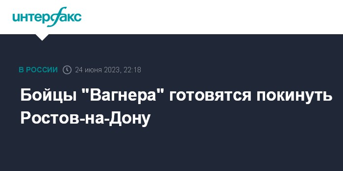Москва. 24 июня. INTERFAX.RU - Бойцы группы "Вагнер" вечером в субботу начали покидать территорию возле штаба Южного военного округа в Ростове-на-Дону, передает корреспондент "Интерфакса" с места событий.
