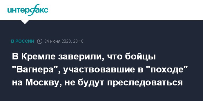 Москва. 24 июня. INTERFAX.RU - Бойцы ЧВК "Вагнер", которые приняли участие в "походе" на Москву, не будут преследоваться по закону, остальные смогут подписать контракт с Минобороны, заявил журналистам пресс-секретарь президента РФ Дмитрий Песков.