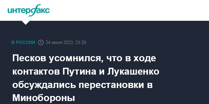 Москва. 24 июня. INTERFAX.RU - Пресс-секретарь президента РФ Дмитрий Песков выразил сомнение в том, что тема перестановок в Минобороны РФ обсуждалась в ходе контактов президентов РФ и Белоруссии Владимира Путина и Александра Лукашенко в связи с ситуацией вокруг Евгения Пригожина.