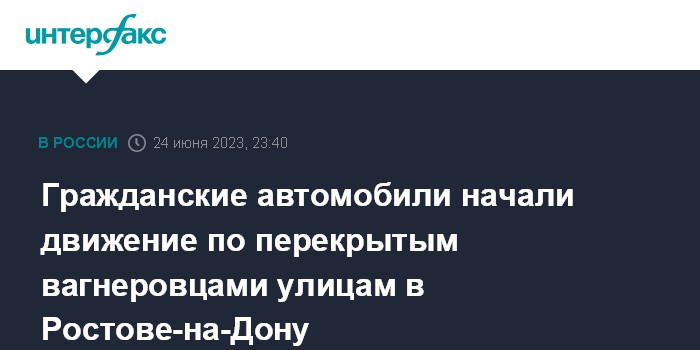 Москва. 24 июня. INTERFAX.RU - Движение транспорта возобновлено по части Буденновского проспекта и улицы Пушкинская в Ростове-на-Дону после того, как бойцы группы "Вагнера" покинули штаб Южного военного округа, передает корреспондент "Интерфакса" с места события.