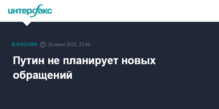 Москва. 24 июня. INTERFAX.RU - Президент РФ Владимир Путин продолжает работать в Кремле, никаких обращений новых от него не планируется, сообщил пресс-секретарь главы государства Дмитрий Песков.
