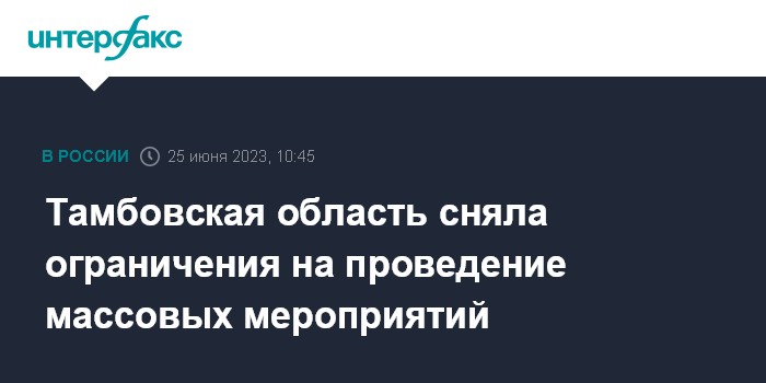 Москва. 25 июня. INTERFAX.RU - Глава Тамбовской области Максим Егоров сообщил об отмене запрета на проведение массовых мероприятий, введенного накануне из-за оперативной обстановки.