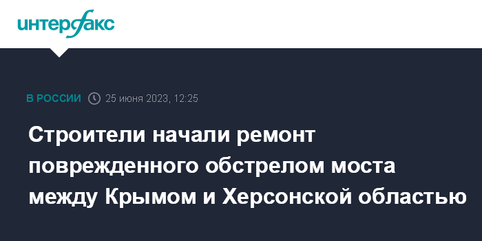 Москва. 25 июня. INTERFAX.RU - Ремонт поврежденного украинским обстрелом моста на административной границе между Крымом и Херсонской областью вблизи Чонгара начался, сообщил в воскресенье врио губернатора Владимир Сальдо.