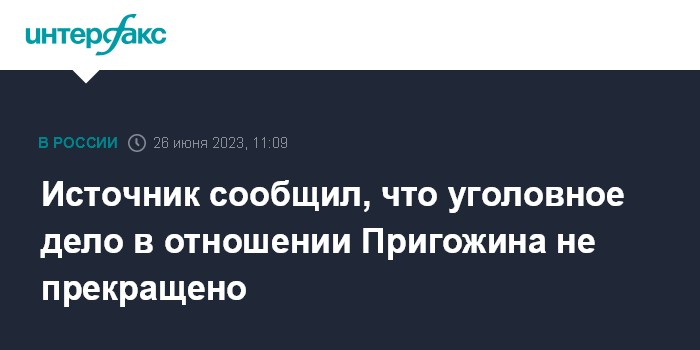 Москва. 26 июня. INTERFAX.RU - Уголовное дело в отношении руководителя "Вагнера" Евгения Пригожина об организации мятежа не прекращено, сообщил "Интерфаксу" источник в Генпрокуратуре РФ.