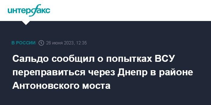 Москва. 26 июня. INTERFAX.RU - Группы украинских военных предприняли в Херсонской области несколько безуспешных попыток переправиться через Днепр и спрятаться под сохранившимися пролетами Антоновского моста на левом берегу, сообщил врио губернатора Владимир Сальдо.