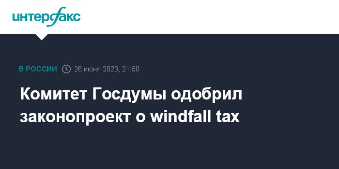 Три фракции Думы отказались поддержать поправки в БК о нормативе зачисления windfall taxЧитать подробнее"Предлагается установить налог на сверхприбыль, он будет рассчитываться как превышение средней прибыли за 2021-2022 гг. над средней прибылью за 2018-2019 гг., то есть эта та прибыль, которая сформирована за счет конъюнктурных доходов в постпандемийный период", - пояснил в ходе заседания комитета замминистра финансов Алексей Сазанов.