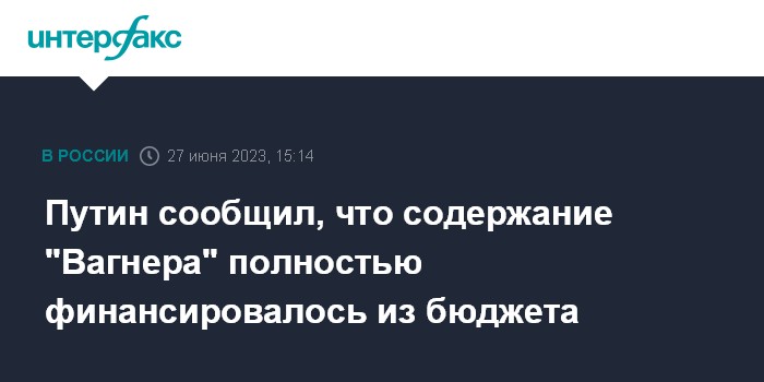 Москва. 27 июня. INTERFAX.RU - Финансирование группы "Вагнер" было обеспечено государством, заявил президент РФ Владимир Путин.