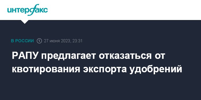 Москва. 27 июня. INTERFAX.RU - Российская ассоциация производителей удобрений (РАПУ) предлагает перейти от квотирования к лицензированию экспорта удобрений, не ограниченному квотами.