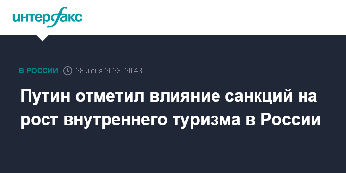 Москва. 28 июня. INTERFAX.RU - Рост внутреннего туризма в России обеспечен, в том числе, санкциями со стороны ряда государств, заявил президент РФ Владимир Путин.