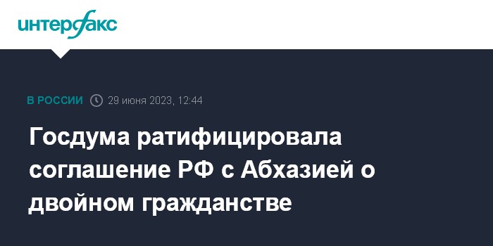 Москва. 29 июня. INTERFAX.RU - Госдума на заседании в четверг ратифицировала соглашение между РФ и Республикой Абхазия об урегулировании вопросов двойного гражданства.