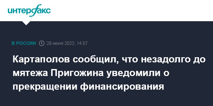 Картаполов сообщил, что незадолго до мятежа Пригожина уведомили о прекращении финансирования