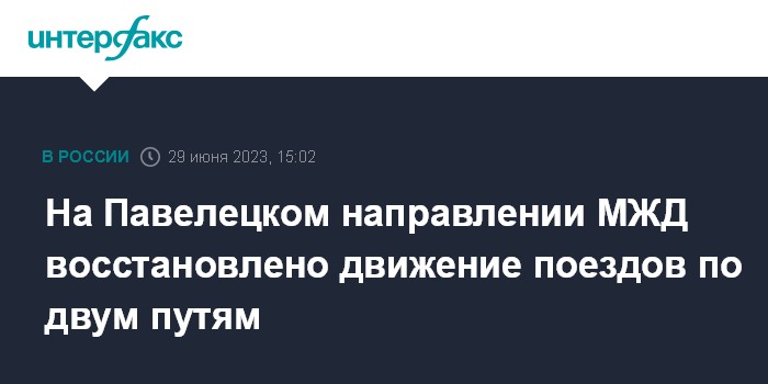Москва. 29 июня. INTERFAX.RU - Движение поездов на Павелецком направлении Московской железной дороги восстановлено по двум путям, сообщает ОАО "РЖД".