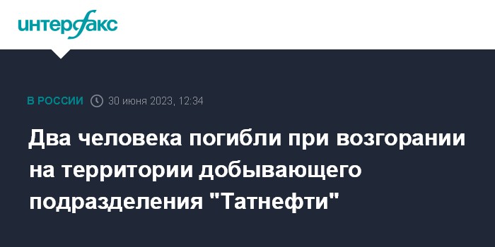 "Утром 30 июня 2023 года в Заинском районе республики на территории ПАО "Татнефть" НГДУ "Елховнефть" в результате возгорания, произошедшего во время исследования резервуара для повторного заполнения нефтяными продуктами, погибли двое рабочих 1976 и 1987 г.р.", - говорится в пресс-релизе.