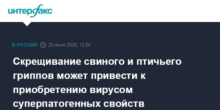 Москва. 20 июля. INTERFAX.RU - Главный государственный санитарный врач РФ Геннадий Онищенко опасается возможного скрещивания птичьего и свиного гриппа, что может привести к возникновению нового, более опасного вируса.