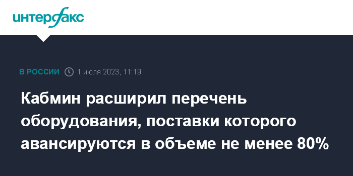 Москва. 1 июля. INTERFAX.RU - Правительство РФ расширило перечень оборудования, поставки которого авансируются в объеме не менее 80% цены контракта при государственных закупках, соответствующее постановление подписал премьер-министр России Михаил Мишустин.