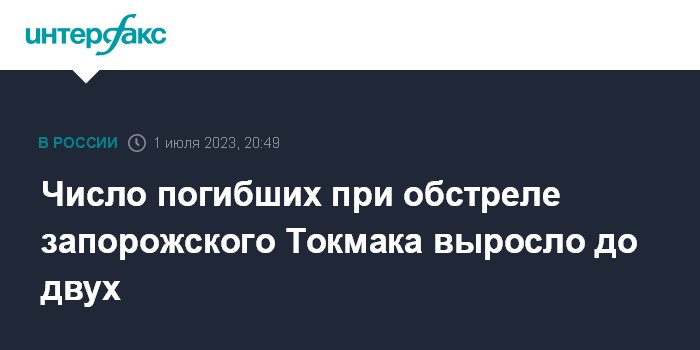 Москва. 1 июля. INTERFAX.RU - Два человека, по уточненной информации, погибли в результате ракетного обстрела со стороны Украины города Токмак на севере Запорожской области, сообщили в экстренных службах региона.