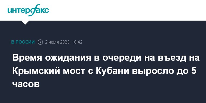 Москва. 2 июля. INTERFAX.RU - Ожидание в растущей очереди из автотранспорта на подъезде к Крымскому мосту со стороны Краснодарского края по состоянию на 10 часов утра составляет до пяти часов, сообщил в воскресенье министр транспорта Крыма Николай Лукашенко.