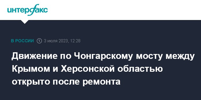 Москва. 3 июля. INTERFAX.RU - Поврежденный украинским обстрелом мост на административной границе между Крымом и Херсонской областью вблизи Чонгара восстановлен и открыт для движения, сообщил председатель херсонского правительства Андрей Алексеенко.