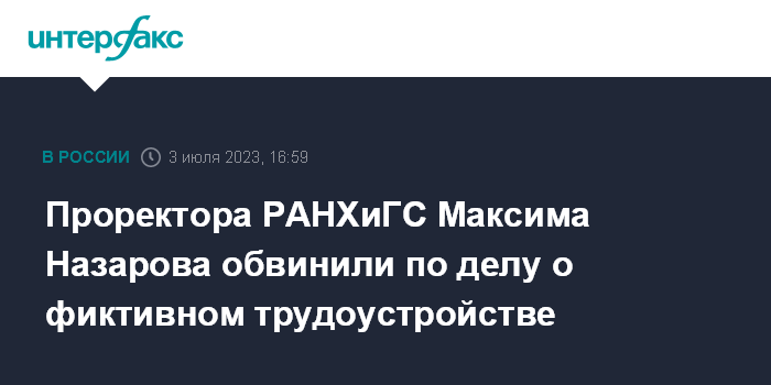 Москва. 3 июля. INTERFAX.RU - Проректору РАНХиГС Максиму Назарову предъявлено обвинение в мошенничестве в рамках уголовного дела, по которому проходят бывшая замминистра просвещения РФ Марина Ракова и экс-ректор "Шанинки" Сергей Зуев, ему избрана мера пресечения в виде запрета определенных действий.
