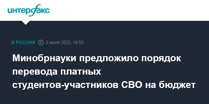 Москва. 3 июля. INTERFAX.RU - Минобрнауки сообщило, что подготовило проект постановления правительства, который предоставит возможность участникам специальной военной операции переходить с платного обучения на бюджет.