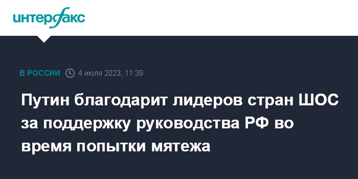 Москва. 4 июля. INTERFAX.RU - Президент РФ Владимир Путин выразил благодарность лидерам стран ШОС за поддержку действий российского руководства во время попытки вооруженного мятежа.
