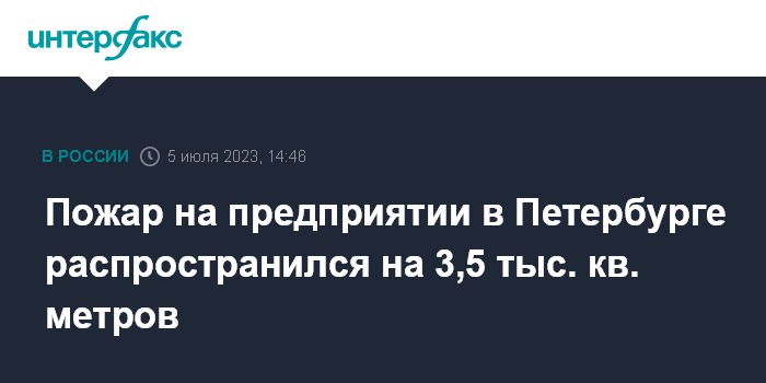 Москва. 5 июля. INTERFAX.RU - Площадь возгорания на территории предприятия во Фрунзенском районе Петербурга выросла в несколько раз - до 3,5 тыс. кв. метров, сообщает в среду пресс-служба городского главка МЧС.