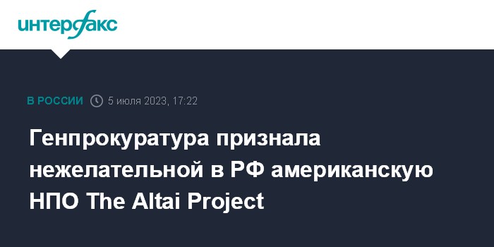 Москва. 5 июля. INTERFAX.RU - Генеральная прокуратура РФ признала нежелательной на территории России деятельность неправительственной организации из США The Altai Project, сообщили "Интерфаксу" в пресс-службе ведомства.