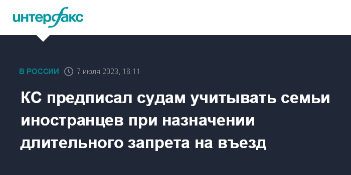 Москва. 7 июля. INTERFAX.RU - Нарушение миграционных сроков пребывания в отсутствие других оснований для запрета на въезд в Россию не может иметь превалирующего значения для суда без учета возможных негативных последствий для российской семьи иностранца, к такому выводу пришел Конституционный суд РФ.