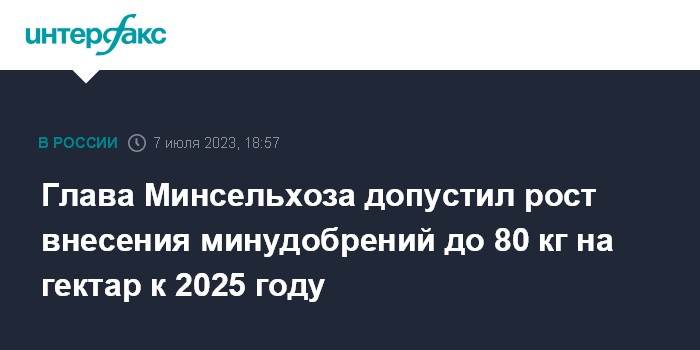 Москва. 7 июля. INTERFAX.RU - Внесение минеральный удобрений в российском АПК к 2025 году может достичь 80 кг на гектар, прогнозирует министр сельского хозяйства Дмитрий Патрушев. Он заявил об этом на пленарном заседании в рамках агровыставки "Всероссийский день поля" в Татарстане.