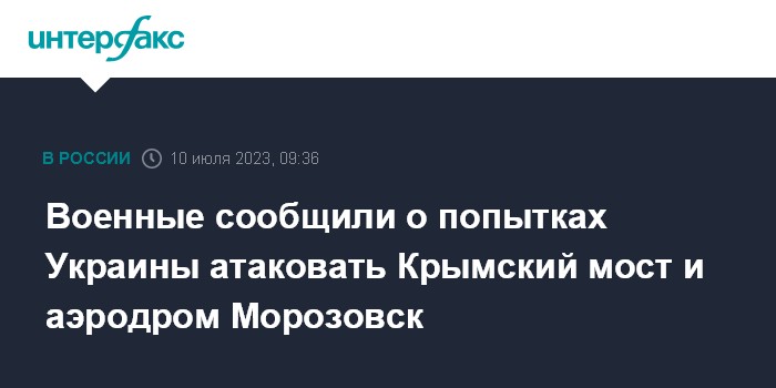 Москва. 10 июля. INTERFAX.RU - Среди объектов, которые пыталась атаковать Украина, был Крымский мост и военный аэродром в Ростовской области, сообщил на совещании у начальника Генштаба, командующего объединенной группировкой войск в зоне СВО Валерия Герасимова, начальник главного штаба ВКС генерал-полковник Виктор Афзалов.