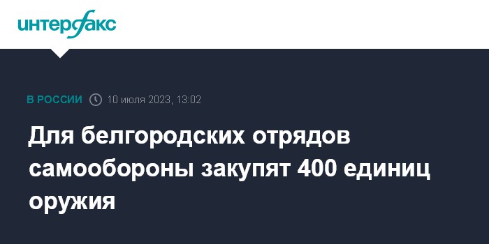 Москва. 10 июля. INTERFAX.RU - В Белгородской области для батальонов самообороны создадут организацию с лицензией на огнестрельное оружие, она закупит 400 единиц огнестрела, сообщил на оперативном совещании референт губернатора региона Олег Мантулин.