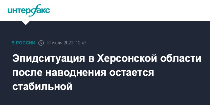 Москва. 10 июля. INTERFAX.RU - Эпидемиологическая ситуация в Херсонской области и на прилегающих территориях, где после разрушения дамбы Каховского водохранилища произошло затопление, остается стабильной, сообщил в понедельник Роспотребнадзор.