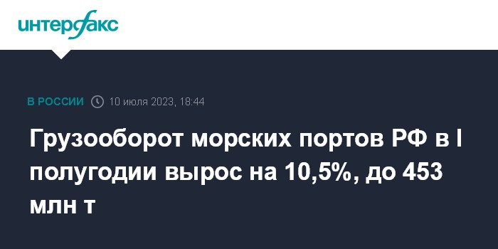 Москва. 10 июля. INTERFAX.RU - Грузооборот морских портов РФ в январе-июне 2023 года увеличился на 10,5% по сравнению с тем же периодом 2022 года, до 453,3 млн тонн, сообщило Федеральное агентство морского и речного транспорта (Росморречфлот).