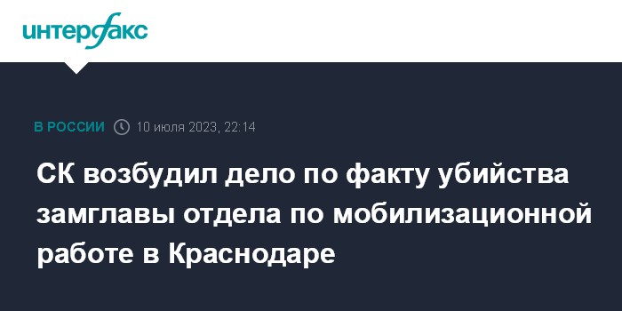 Москва. 10 июля. INTERFAX.RU - Следственный комитет возбудил уголовное дело по факту убийства замначальника краснодарского городского отдела по мобилизационной работе Станислава Ржицкого.