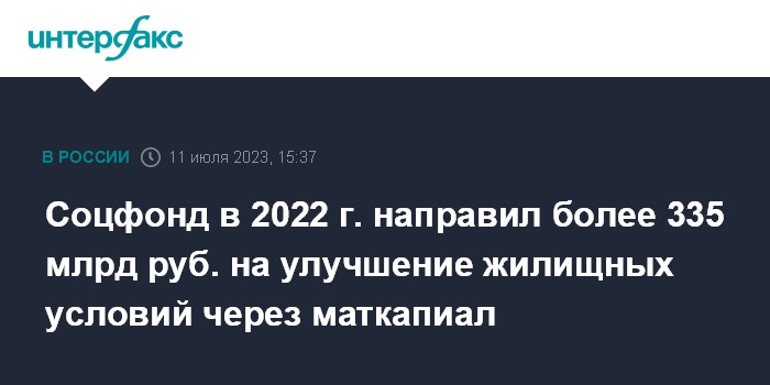 Москва. 11 июля. INTERFAX.RU - На самое популярное направление для маткапитала в 2022 году - улучшение жилищных условий - Социальный фонд России выделил 335,7 млрд рублей, сообщил глава Соцфонда РФ Сергей Чирков.