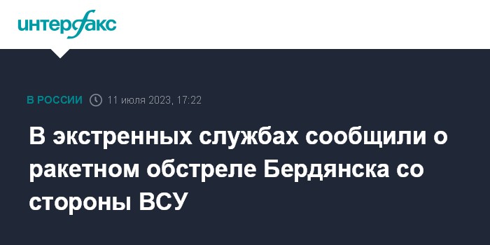 Москва. 11 июля. INTERFAX.RU - Бердянск на берегу Азовского моря в юго-восточной части Запорожской области попал во вторник под ракетный обстрел со стороны Вооруженных сил Украины, сообщил журналистам представитель экстренных служб региона.