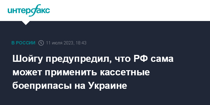 Москва. 11 июля. INTERFAX.RU - Россия воздерживается от применения кассетных боеприпасов, но обратится к таким снарядам в качестве ответной меры на поставки их Украине, заявил министр обороны РФ Сергей Шойгу.