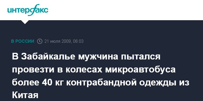 Чита. 21 июля. ИНТЕРФАКС-СИБИРЬ - На международном пункте пропуска "Забайкальск" пограничники задержали гражданина России, пытавшегося ввезти 40 кг контрабандной одежды из Китая.