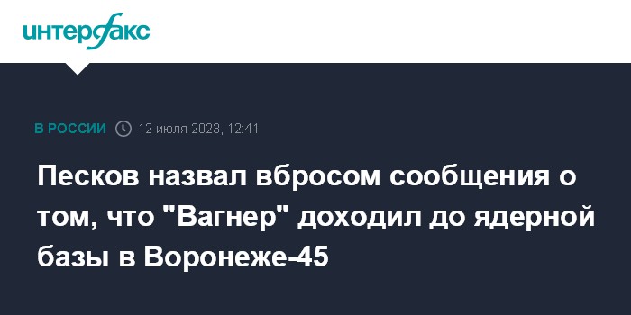 Москва. 12 июля. INTERFAX.RU - Пресс-секретарь президента РФ Дмитрий Песков назвал вбросом сообщения о том, что бойцы группы "Вагнер" в ходе попытки мятежа достигли складов ядерного оружия в Воронеже-45.