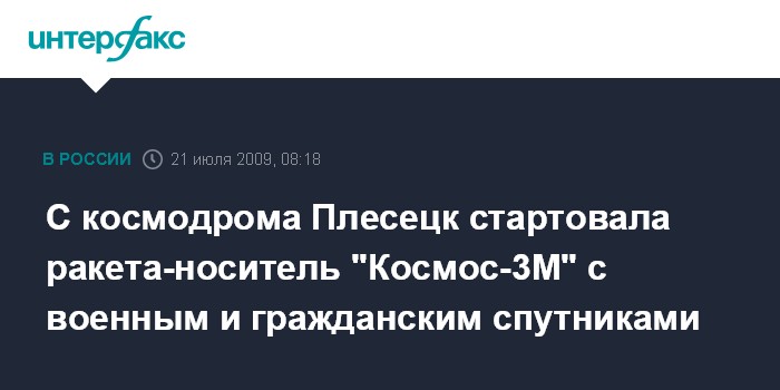 Москва. 21 июля. INTERFAX.RU - Боевые расчеты Космических войск РФ осуществили в 07:57 мск вторника с космодрома Плесецк (Архангельская область) пуск ракеты-носителя "Космос-3М" с блоком из двух космических аппаратов, сообщил "Интерфаксу-АВН" помощник командующего Космическими войсками подполковник Алексей Золотухин.