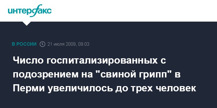Москва. 21 июля. INTERFAX.RU - В Перми госпитализированы три человека с подозрением на "свиной грипп", сообщил губернатор Пермского края Олег Чиркунов в своем интернет-блоге.