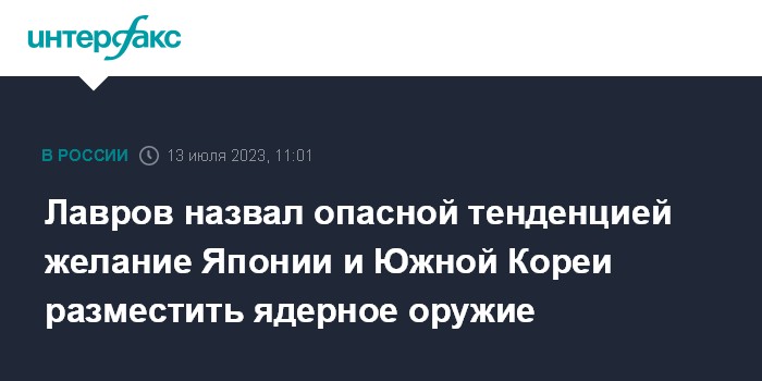 Москва. 13 июля. INTERFAX.RU - Глава МИД РФ Сергей Лавров назвал опасной тенденцией желание Японии и Южной Кореи обзавестись собственным ядерным оружием.