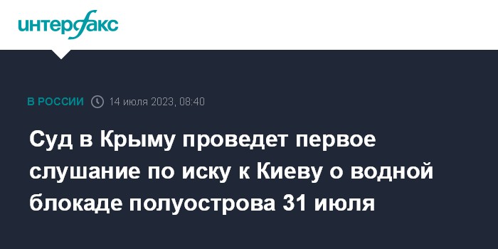 Москва. 14 июля. INTERFAX.RU - Арбитражный суд Крыма проведет первое слушание по делу о взыскании с Украины ущерба от водной блокады полуострова 31 июля, сообщил председатель крымского парламента Владимир Константинов.