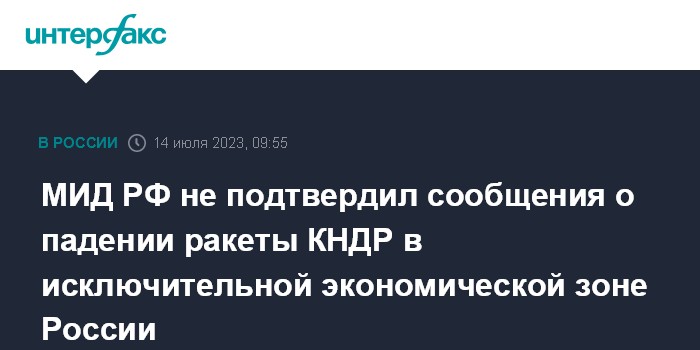 Москва. 14 июля. INTERFAX.RU - Данных, подтверждающих падение северокорейской ракеты в исключительной экономической зоне России, в настоящий момент нет, заявила официальный представитель МИД РФ Мария Захарова.