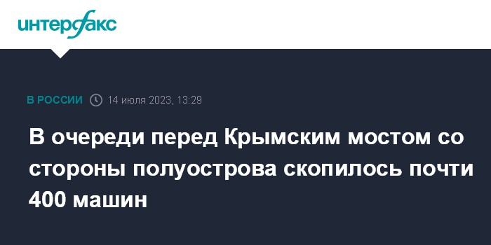 Москва. 14 июля. INTERFAX.RU - Очередь перед Крымским мостом со стороны полуострова выросла почти до 400 машин, сообщает телеграм-канал, освещающий ситуацию на автомобильных подходах к мосту.