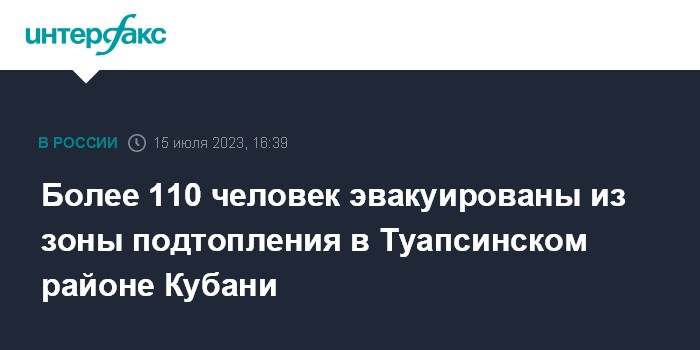 Москва. 15 июля. INTERFAX.RU - Более ста человек эвакуированы из зоны подтопления в Туапсинском районе Кубани после сильных ливней, прошедших в субботу, сообщил глава района Сергей Бойко.