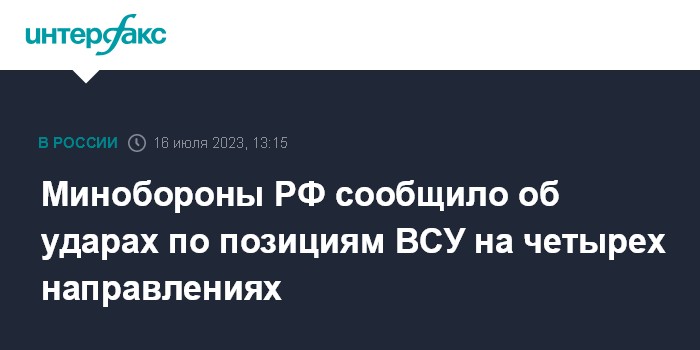 Москва. 16 июля. INTERFAX.RU - Российские военные наносят удары по позициям армии Украины на южно-донецком, запорожском, купянском и херсонском направлениях, сообщил официальный представитель Минобороны РФ Игорь Конашенков.
